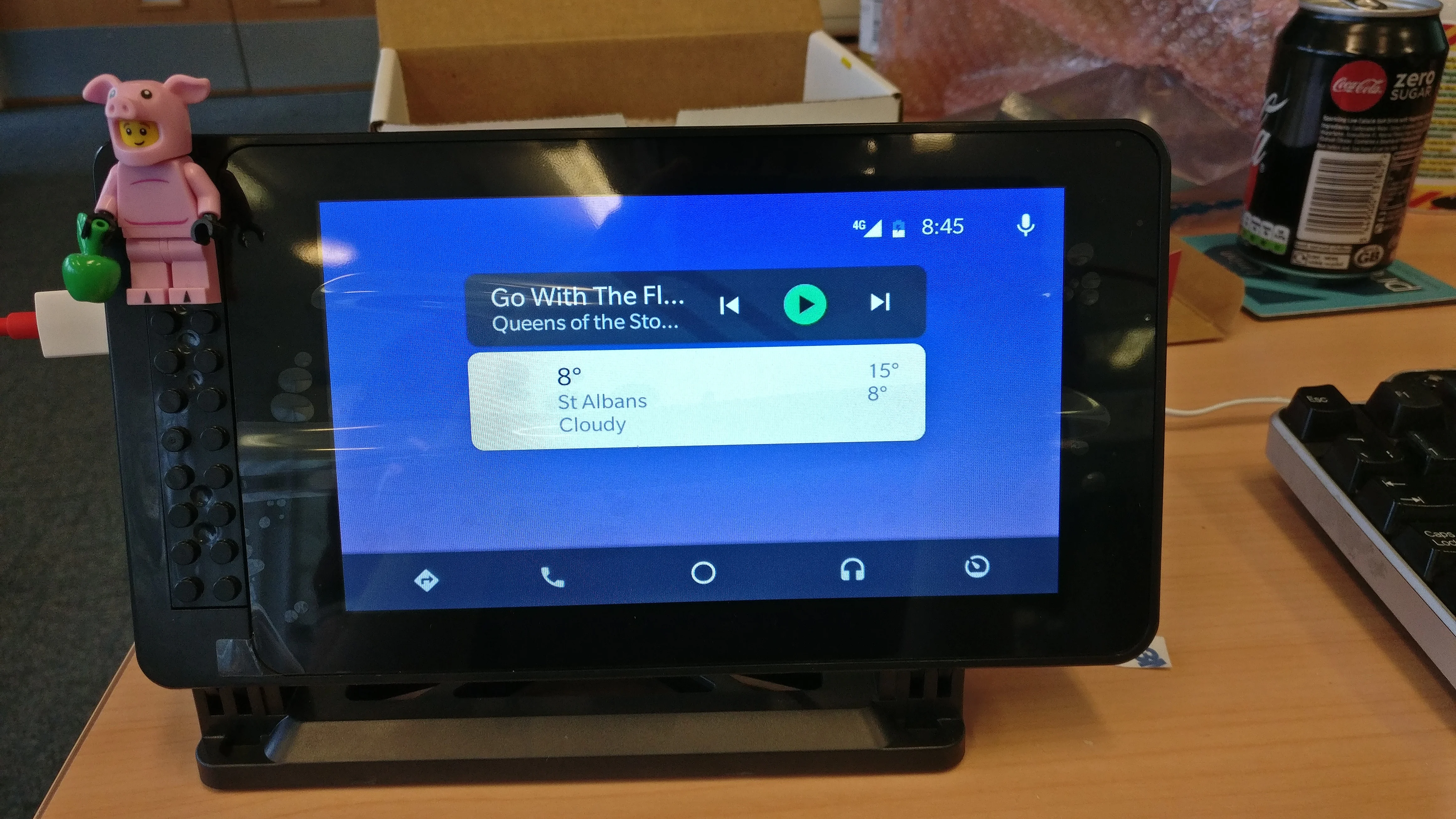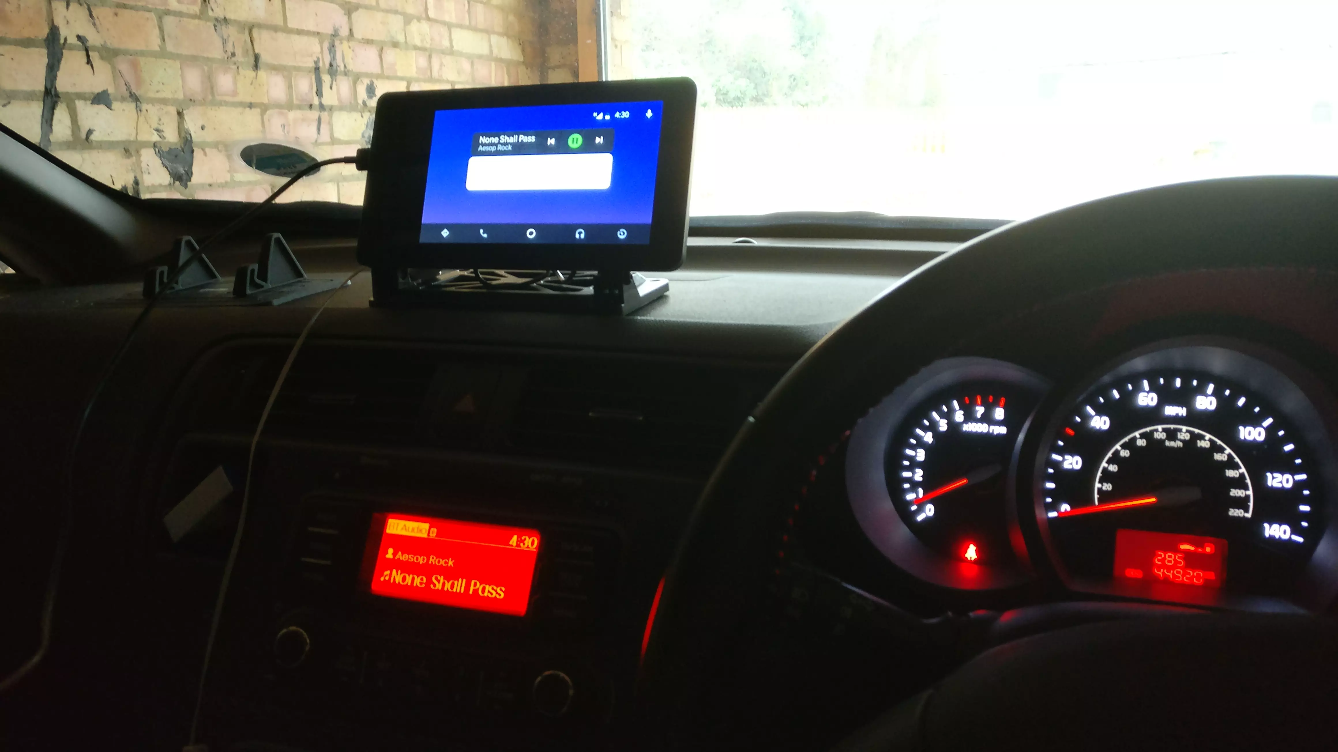 Placed the unit on the dashboard, hooked up a Micro USB cable to the power from a 12V USB adapter, connect up my phone and job done – working Android Auto, basically.