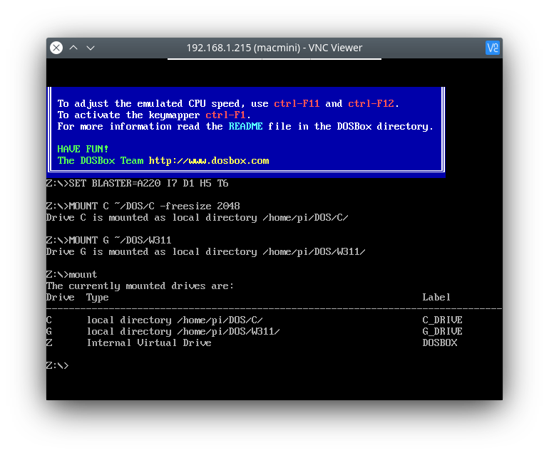 Make a folder in your home directory on the Pi and call it DOS (alongside your Macintosh folder). Inside this folder, make a folder called C. You may have figured it, this is going to be our C drive.