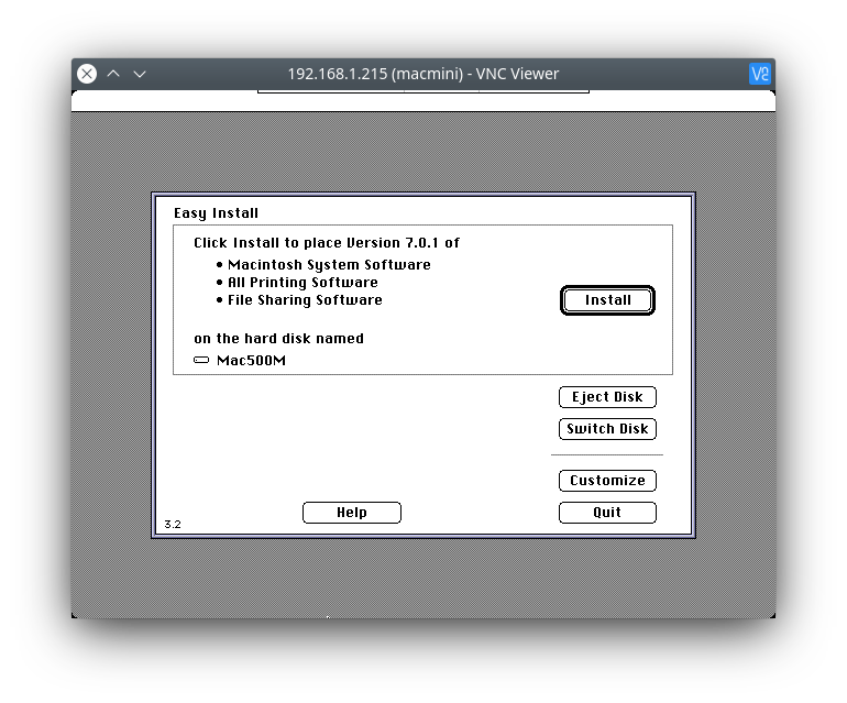 Press ctrl – F to exit full screen mode. Outside the emulator, open the Mac701 folder, and drag Install 1.image onto the emulator screen. This will virtually mount the image file as a Floppy disk in your emulator. Neat! Go back up a folder and drag your disk1.dsk into the emulator screen. Your cardboard Macintosh should now ask if you want to install System 7 onto Mac500M. Now click install.