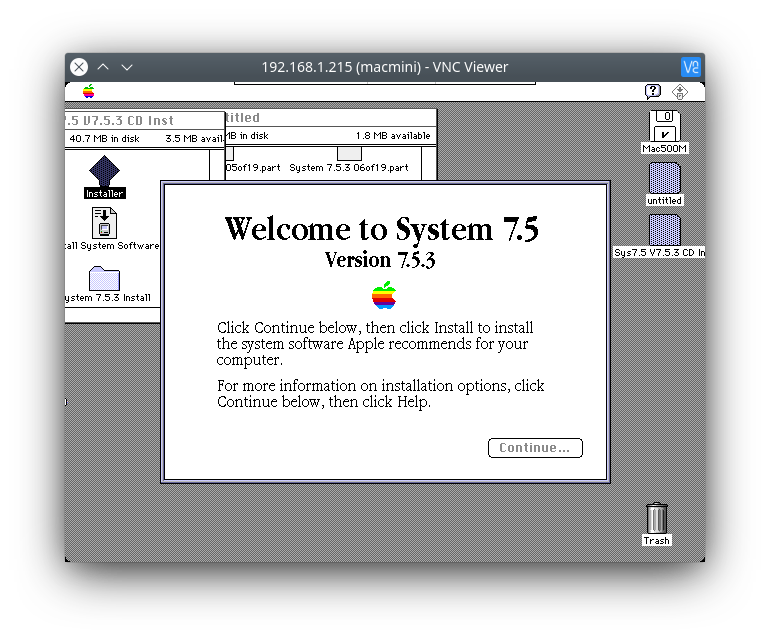 Upgrading is very different to the installation. Boot your cardboard Macintosh, and once you’re in the system, drag mac753.img onto the screen. This will then appear underneath your hard drive in the virtual Mac. Double click on this, and click on Installer (for 7.5.5, click the first part, click agree, then it mounts). Follow the instructions, and you’ll soon be on System 7.5.3.