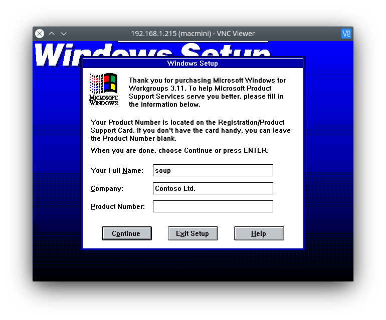 Once this segment finishes (it will take about 1-2 minutes), you’ll then see a more familiar setup screen. Enter a name and company (you don’t need a product number), then continue.