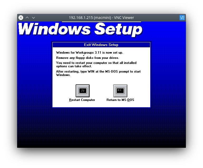 It will now ask if you wish to restart or return to MS-DOS. Click Restart and it will close Dosbox. Congratulations, you’ve installed Windows for Workgroups 3.11!