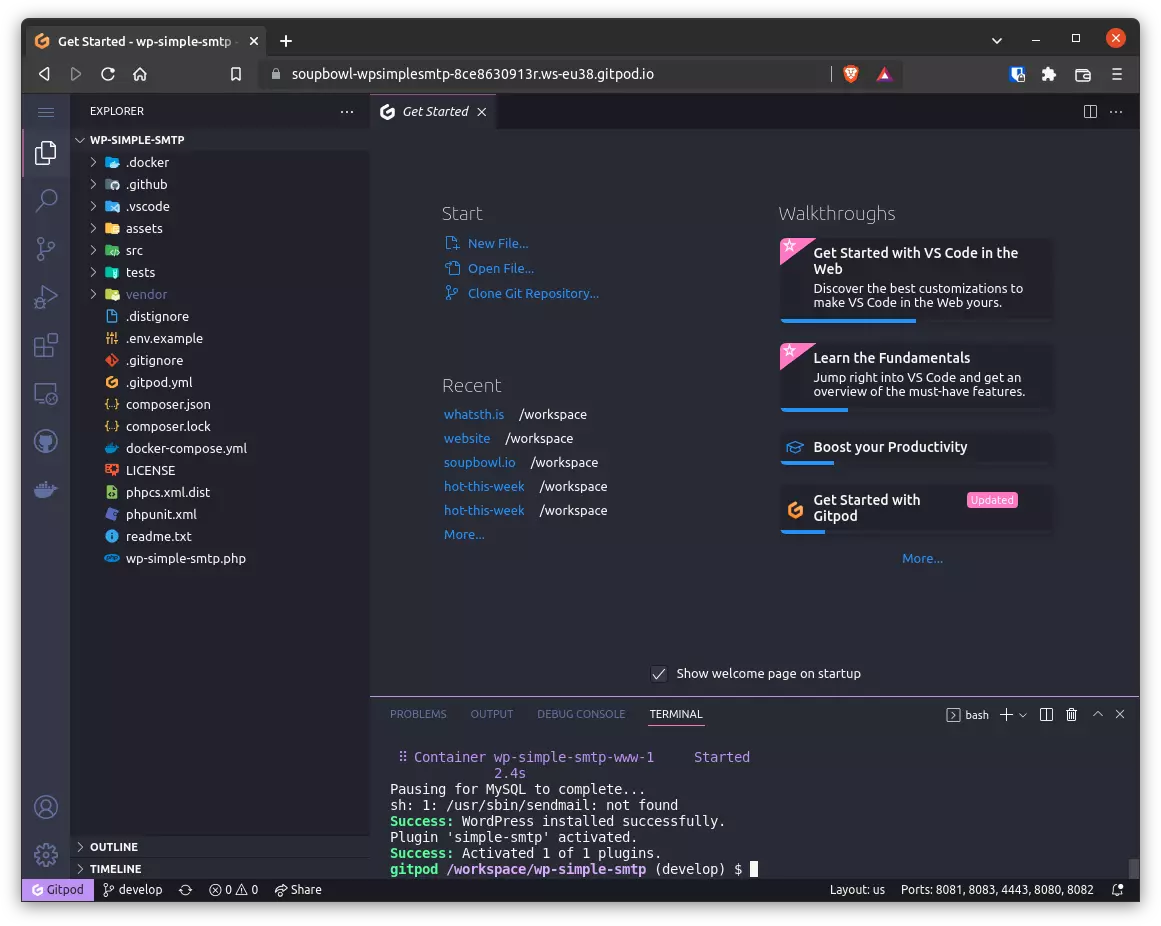 For one of my projects - WordPress Simple SMTP - I had configured Gitpod to immediately grab MySQL, WordPress and Composer docker containers, and compile the WordPress container to contain WordPress CLI. This cuts out around about 2-3 minutes of the start-up process! The rest of my script focuses on minimising the setup process by executing a quick-start shell script on the container, so once my Gitpod initialisation finishes, I’m greeted with a fully installed WordPress instance with the plugin in question already activated and ready to be worked on. Neat, right?